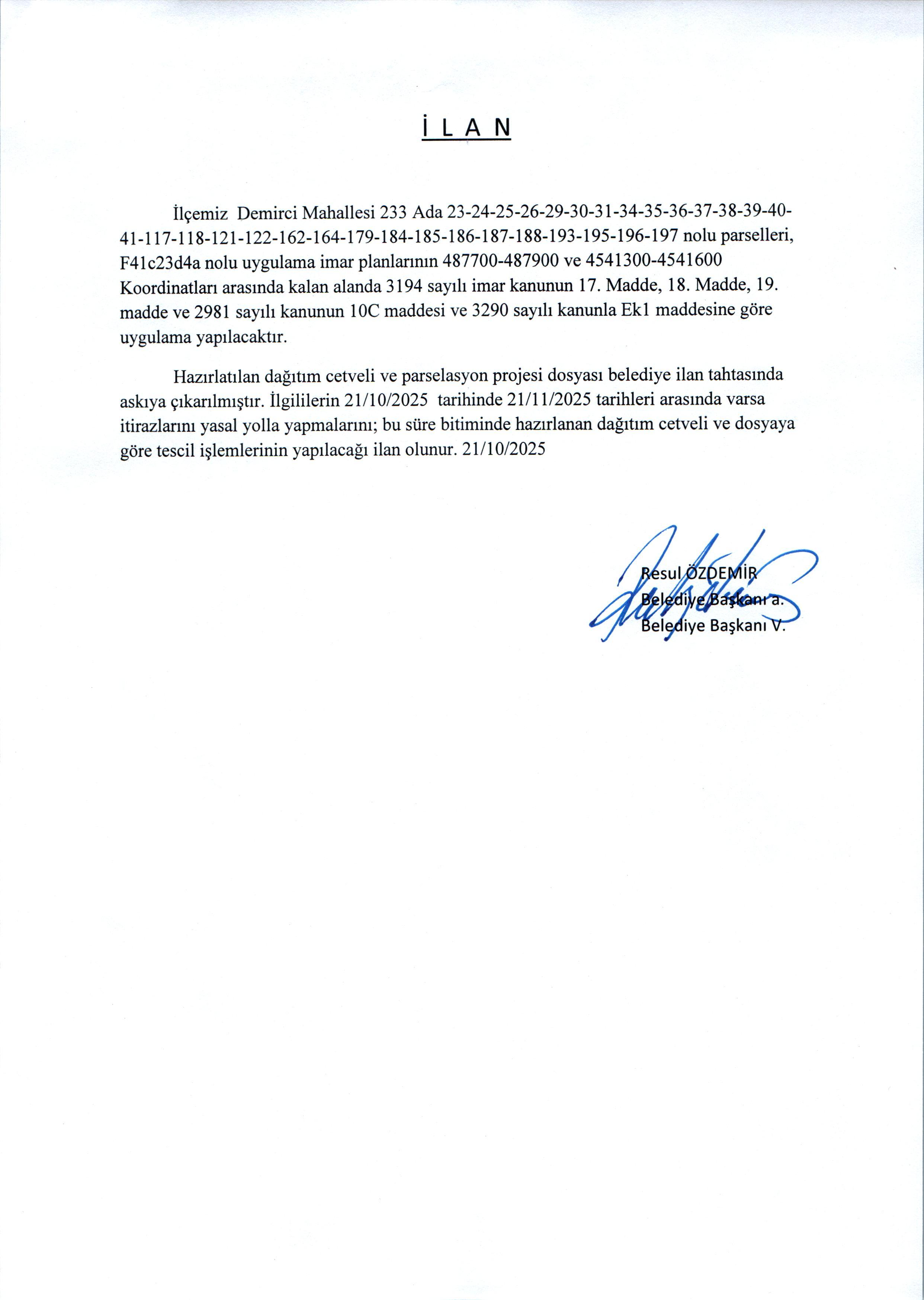 DEMİRCİ MAHALLESİ 233 ADA UYGULAMA