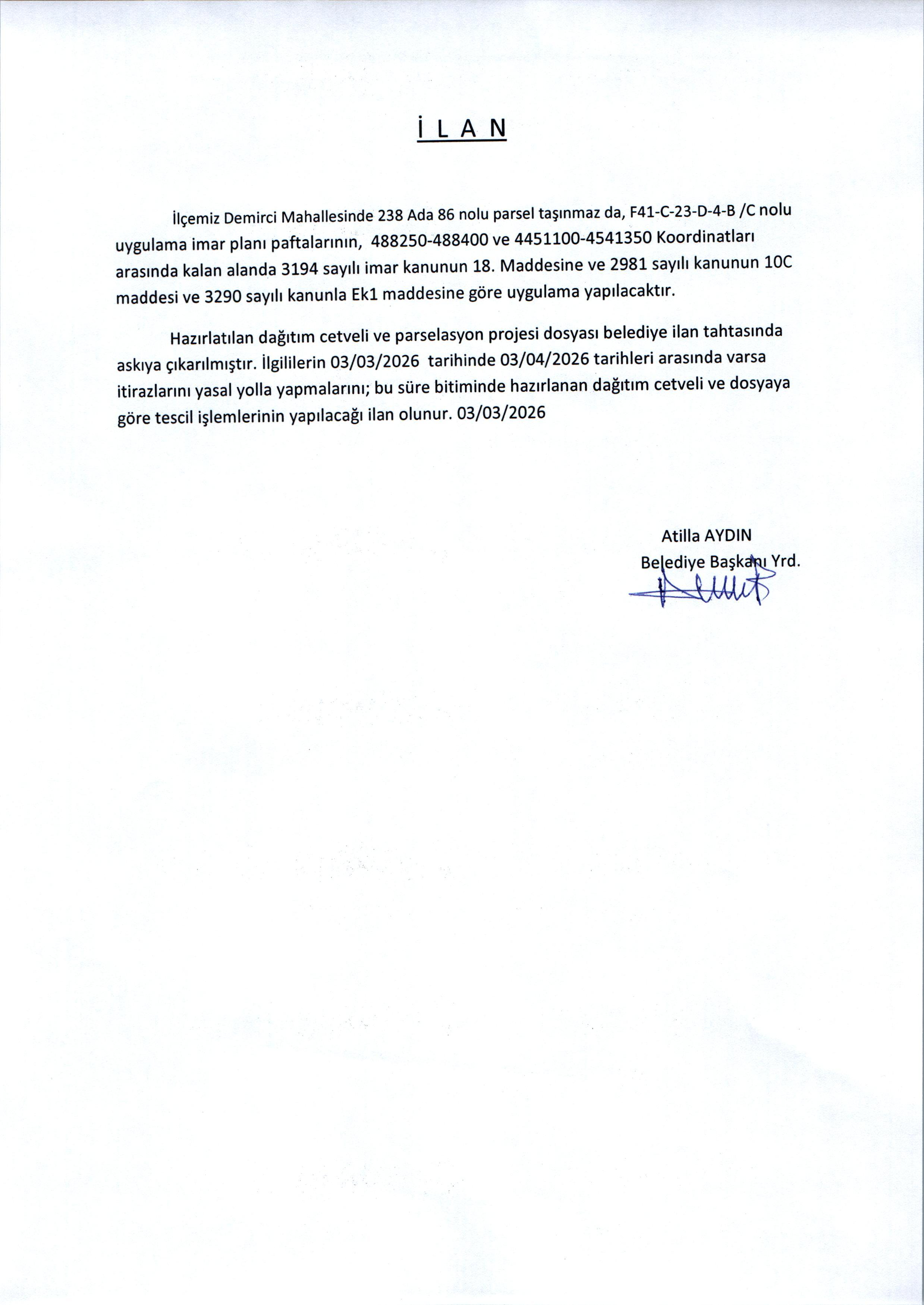 DEMİRCİ MAHALLESİ 238 ADA 86 PARSEL İLAN