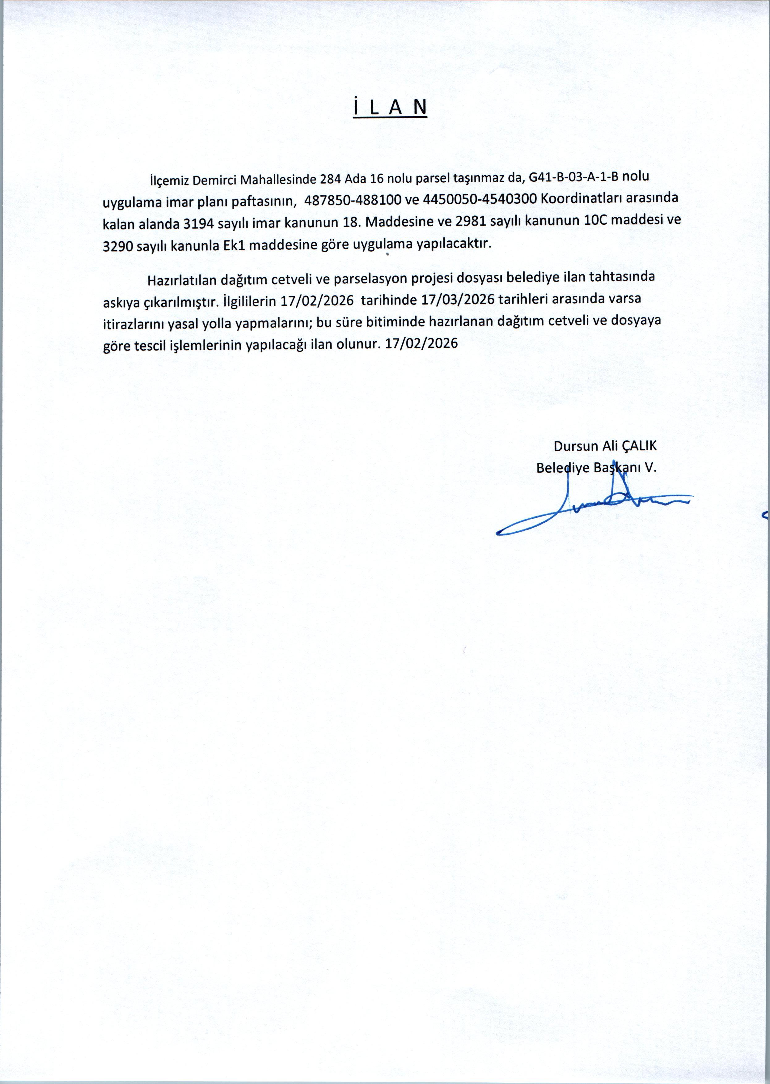 DEMİRCİ MAHALLESİ 284 ADA 16 PARSEL İMAR UYGULAMASI