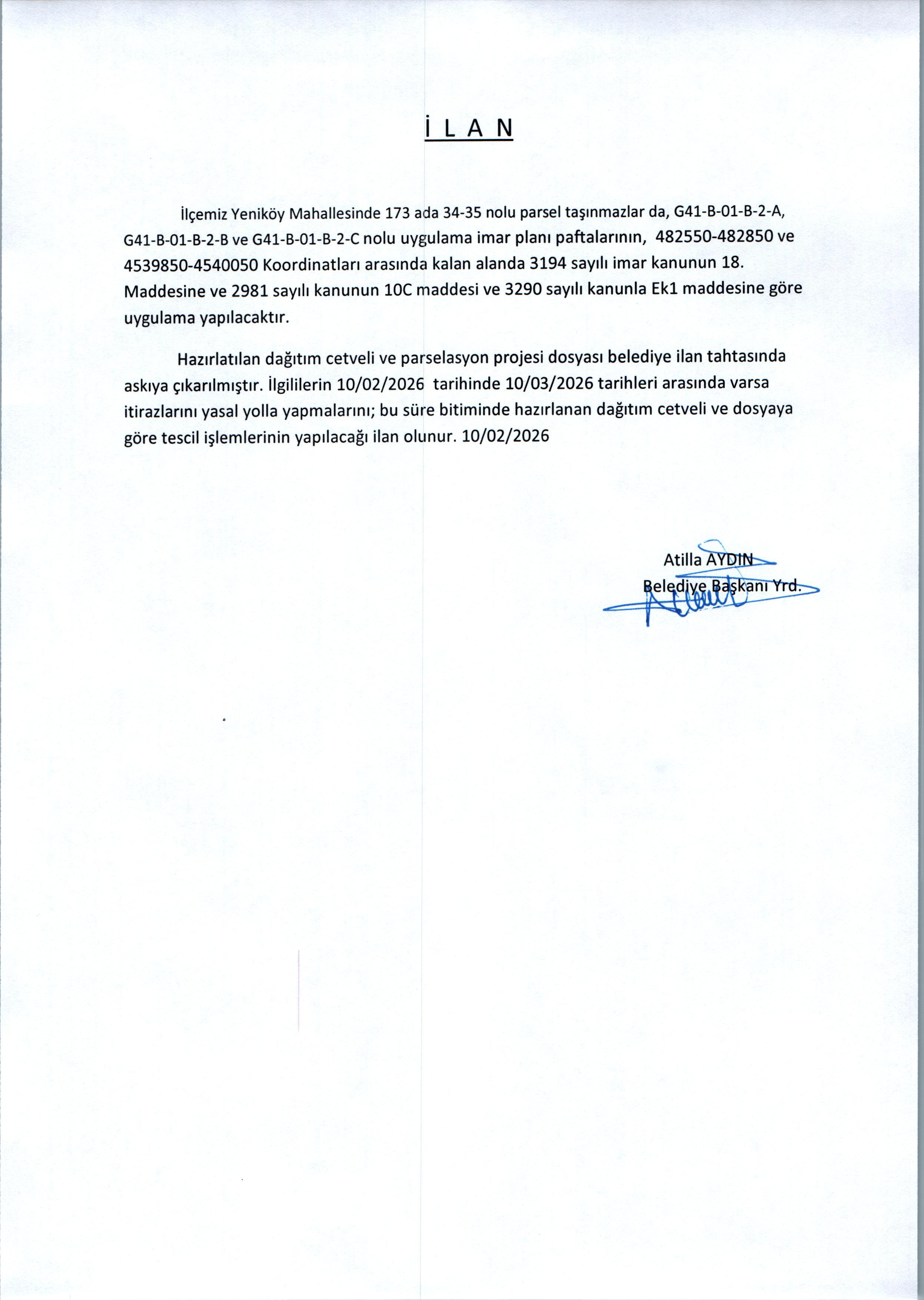 YENİKÖY MAHALLESİ 173 ADA 34 VE 35 PARSEL PLAN DEĞİŞİKLİĞİ