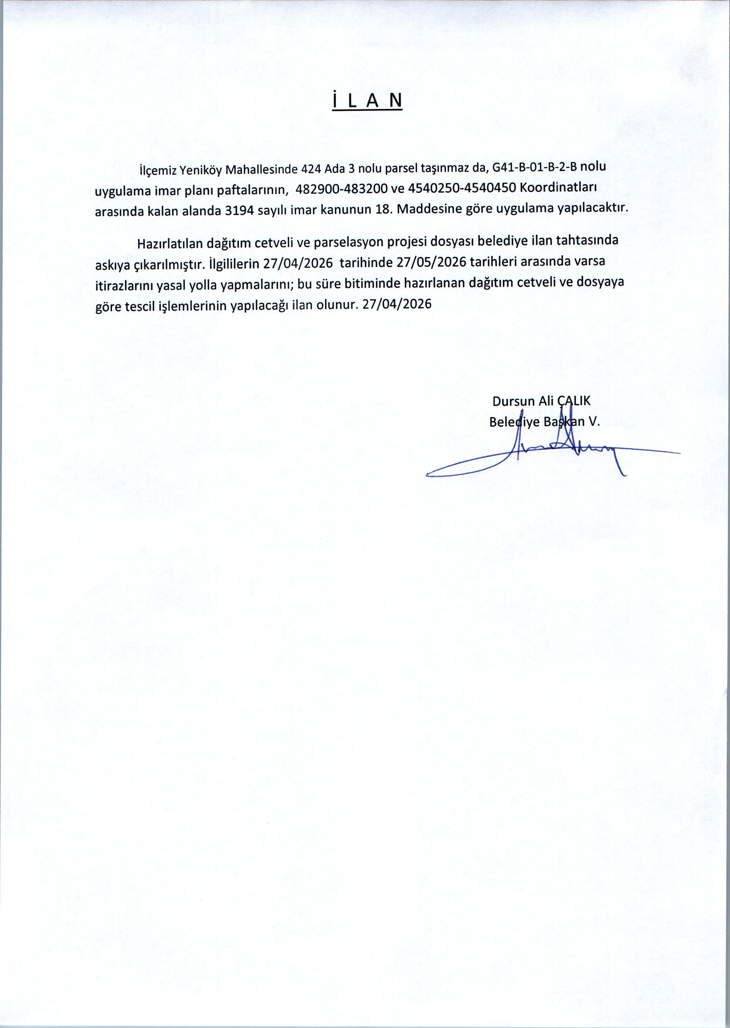 YENİKÖY MAHALLESİ 424 ADA 3 PARSEL İLAN